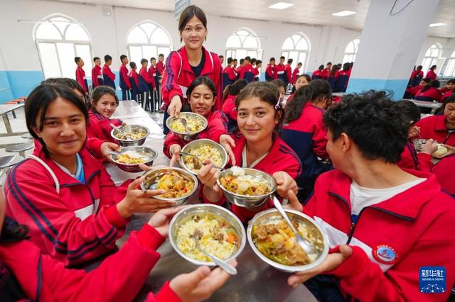 这是在阿图什市硝鲁克中学的食堂里,阿图什市U13女子足球队的队员们展示午餐(4月14日摄)。新华社记者 徐宏岩 摄