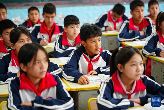 这是在阿图什市硝鲁克中学,阿图什市U13女子足球队前锋谢尔克努尔·亚力坤(二排左二)在教室里上课(4月14日摄)。新华社记者 徐宏岩 摄