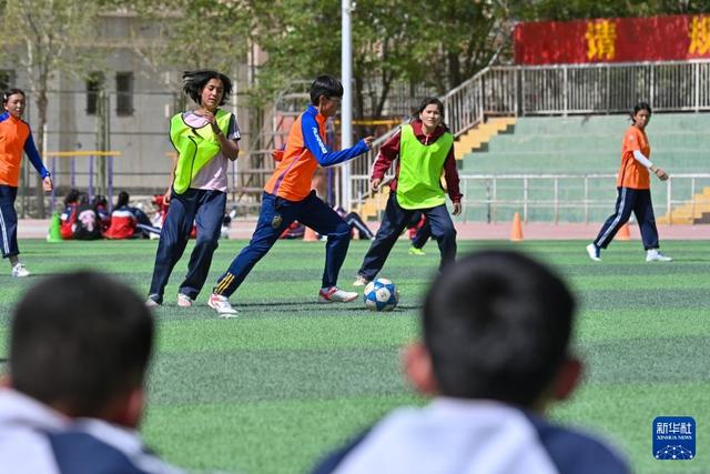 这是在阿图什市硝鲁克中学,阿图什市U13女子足球队球员在训练中进行分组比赛(4月10日摄)。新华社记者 徐宏岩 摄