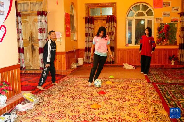 这是在阿图什市亚喀巴格村,阿图什市U13女子足球队球员艾妮再·阿布都如苏力(中)在家中与弟弟和朋友比拼带球技术(4月13日摄)。新华社记者 徐宏岩 摄