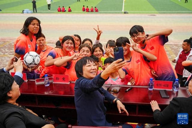 4月12日,2025新疆克孜勒苏柯尔克孜自治州足球联赛在阿图什市开幕,中国足协副主席、前中国国家女子足球队球员孙雯出席开幕式。姑娘们激动地与偶像孙雯合影,并说:“长大后我想成为你!”孙雯笑着答道:“你们可以成为更好的自己。”