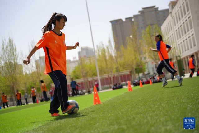 这是在阿图什市硝鲁克中学,阿图什市U13女子足球队中场球员帕提麦·肉孜买买提在进行运球训练(4月10日摄)。新华社记者 徐宏岩 摄