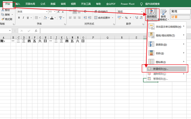 我们再将工具栏切换到“开始”选项卡,选择“条件格式”,再在弹出的下拉菜单里面选择“新建规则”。