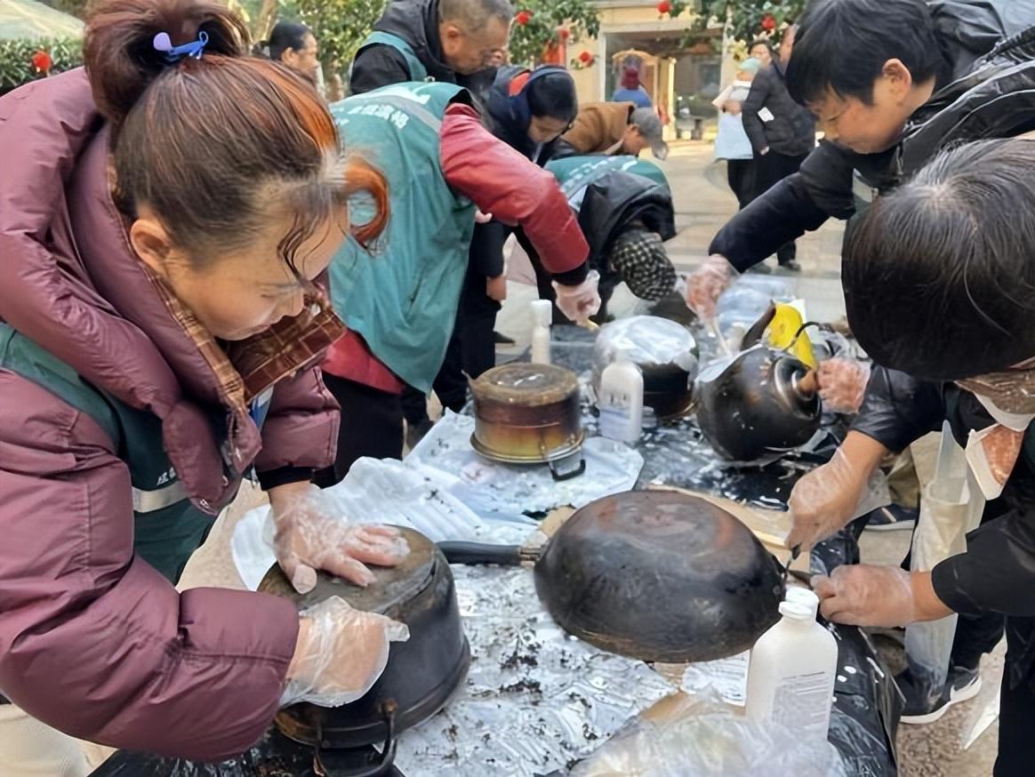 志愿者们还与居民们亲切交流,耐心解答大家关于日常清洁的疑问,并为现场的残障人士提供优先服务,帮助他们将锅具送回家中。