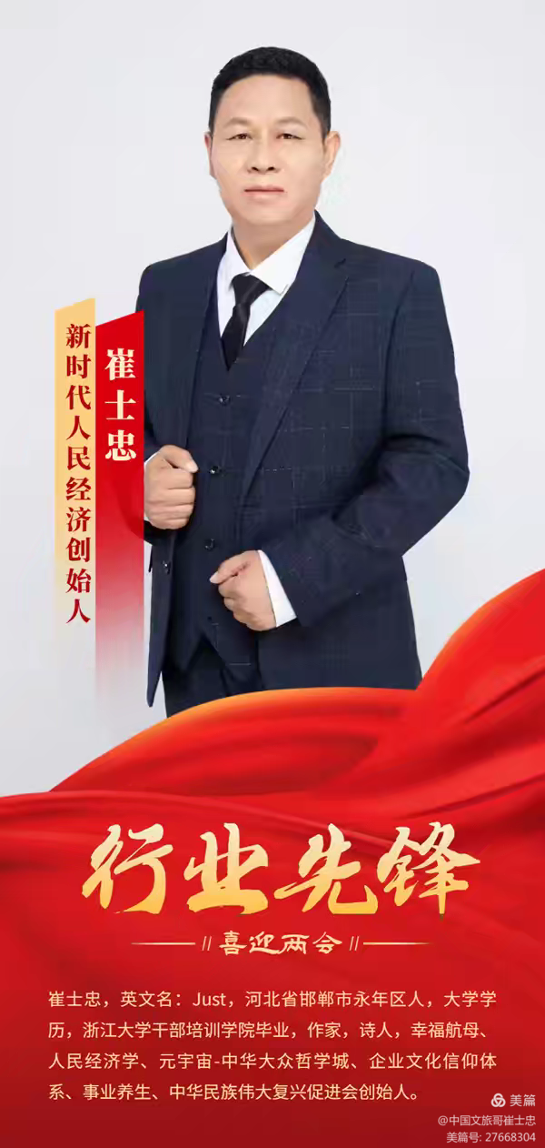 崔士忠,英文名:Just,河北省邯郸市永年区人,大学学历,浙江大学干部培训学院毕业,诗人、人文经济学家、企业家,幸福航母、人民经济学、文旅思政元宇宙-中华大众哲学城、企业文化信仰体系、事业养生、中华民族伟大复兴促进会创始人。国家一级文旅策划营运师,国家一级企业文化策划师,中华文化全球推广大使,《贡献中国-创新发展》形象大使,中国航天科普大使,中国管理科学研究院客座教授,中国东方文化研究会文化研究员,国家首批文化强国智库专家、文旅康养智库专家、中国国际经济技术合作促进会通证经济委员会专家委员、联合国教科文组织特殊荣誉证书获得者。由于策划创造了文旅创新项目四维空间、觉悟彼岸、精神世界、数智经济、自由人联合体的文旅思政元宇宙-中华大众哲学城,被业界称为“中国文旅一哥”。