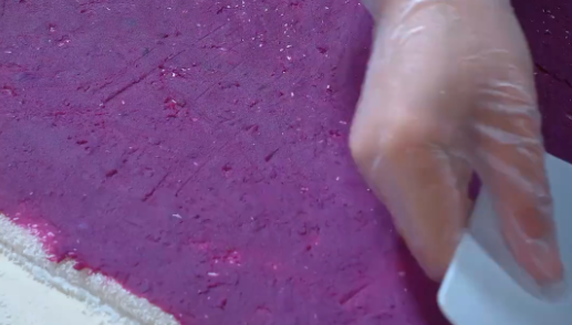 第三步:组合成型案板上撒层椰蓉粉,把揉好的糯米团放上去。用擀面杖慢慢擀成长方形,厚度和小拇指差不多就行。把晾凉的紫薯泥均匀铺在糯米皮上,注意四周要留出一指宽的边。从长的那边开始卷,边卷边轻轻按压,卷好后在表面再撒层椰蓉粉。