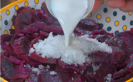 蒸好的紫薯趁热倒进大碗里,加白砂糖和适量牛奶。这里要注意,牛奶不要一次倒太多,用勺子背慢慢压碎。紫薯本身比较干,加牛奶能让它更湿润好成型。最后压成紫薯泥,放旁边晾凉备用。