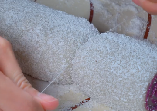 这里教大家个不沾刀的方法:找根缝衣服的棉线,在糯米卷下面绕一圈,两手拽着线头向两边拉,就像裁缝剪布那样,切出来的截面又整齐又不会压扁。切好的糯米卷摆盘时,每个之间要留点空隙,不然容易粘在一起。