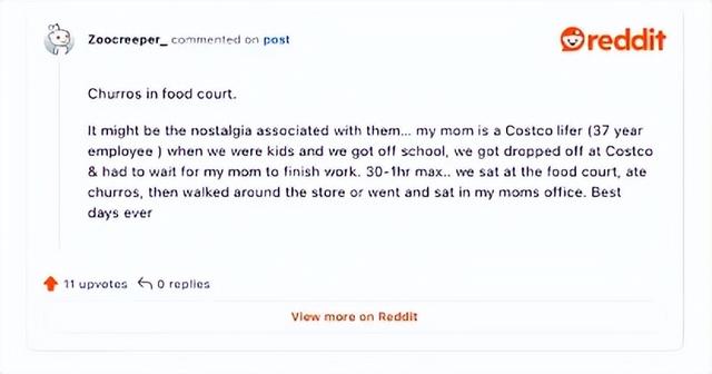“也可能只是怀旧情绪在作祟……我妈妈在 Costco 工作了一辈子(37年的员工),我们小时候放学后被送到 Costco,不得不在这里等妈妈下班,最多 30分钟到1小时……我们坐在美食广场吃吉事果,然后在商店里晃悠,或者去妈妈的办公室坐坐。那是最美好的日子。”