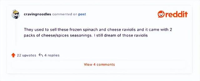 “他们以前卖那种冷冻菠菜奶酪小方饺,里面还附赠两包奶酪/香料调味料。我仍然梦想着它们的味道。”