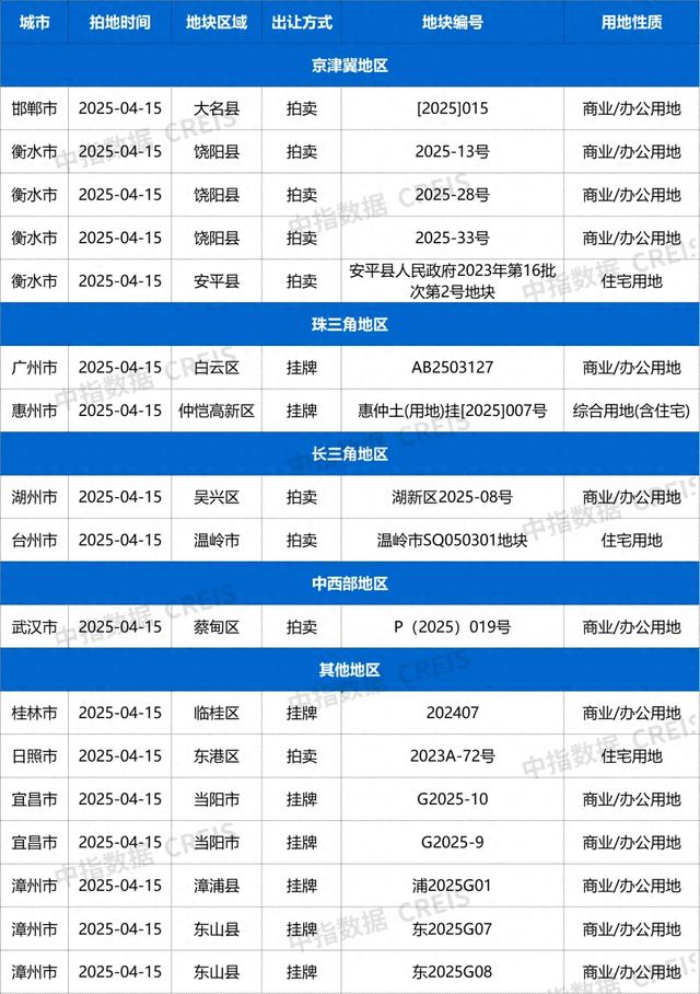 据中指研究院土地情报百城土拍监测数据显示,2025年4月15日11城17宗地块挂牌截止,其中涉宅用地4宗。