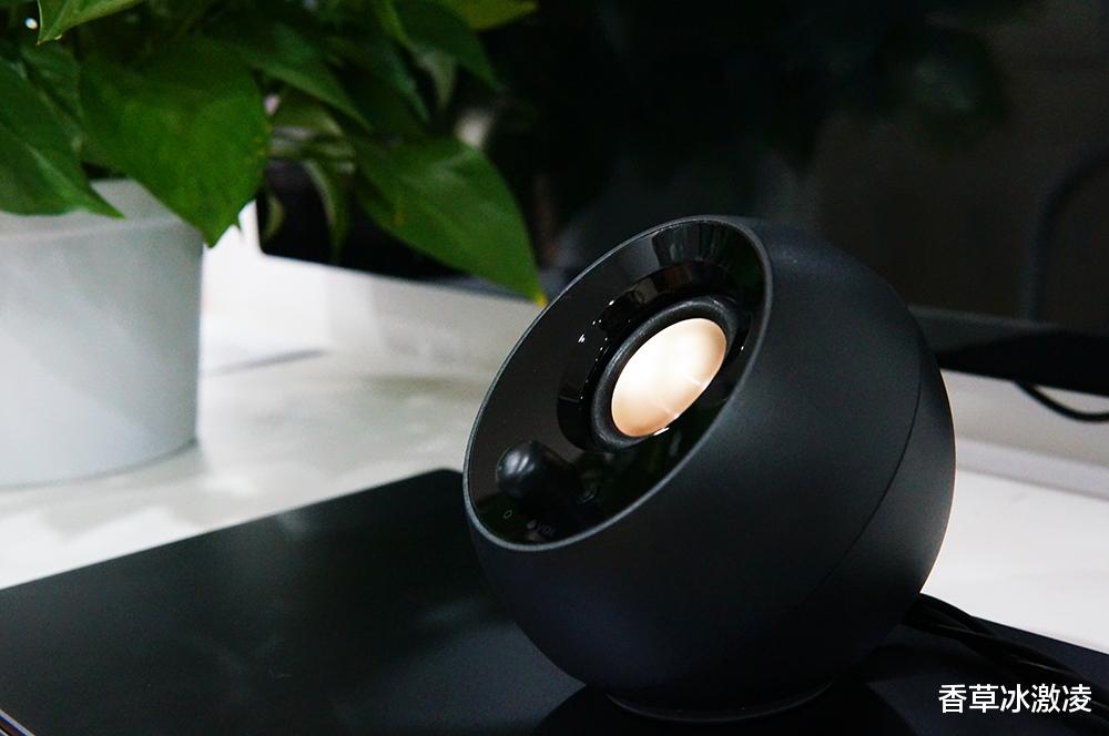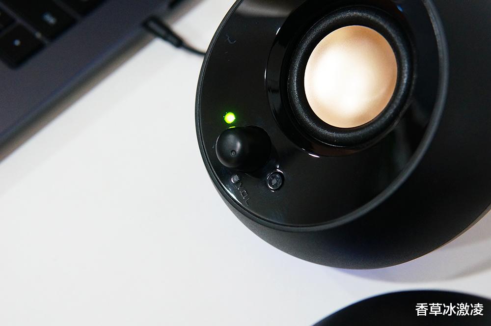 创新科技Pebble SE电脑音箱的所有按键都集中在其中一个的正面,包括电源指示灯,开关/音量旋钮,还有一个LED灯光切换键。