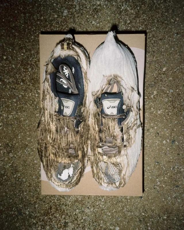 于艺术而言,并不是单指最终给世人呈现出的作品,包括其中的过程也可以称之为艺术(或者可以理解成行为艺术)。洛杉矶品牌 AIREI 受其 2024 春季系列“WINDHORSE”的启发,与 ASICS 合作推出的 Gel-Quantum Kinetic 再次探讨了时间流逝对于物品之间的影响。在鞋子原型的基础上覆盖一层手工纺织品包裹住,并用火焰点燃后达到经风霜侵蚀后的效果。过程是非常具有艺术性的,但似乎原鞋会更好看?