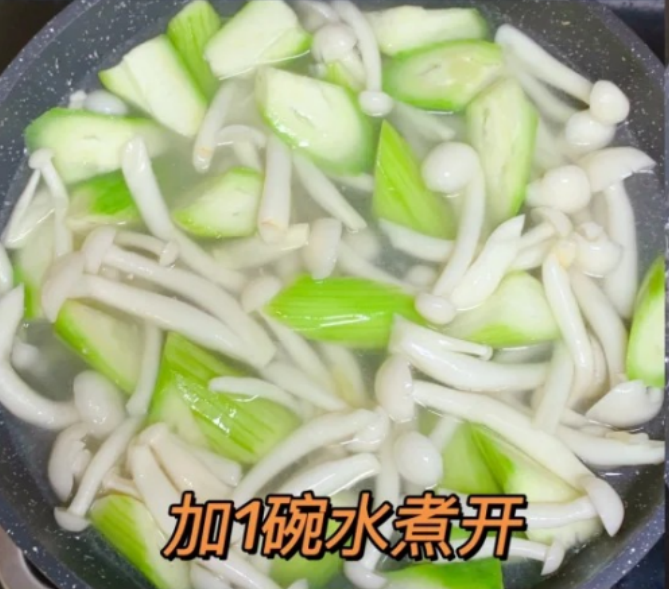 待汤底微沸,轻轻放入海鲜菇和丝瓜块,将汤品色泽煮至变白,让营养都煮到汤品之中。