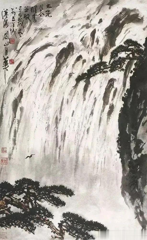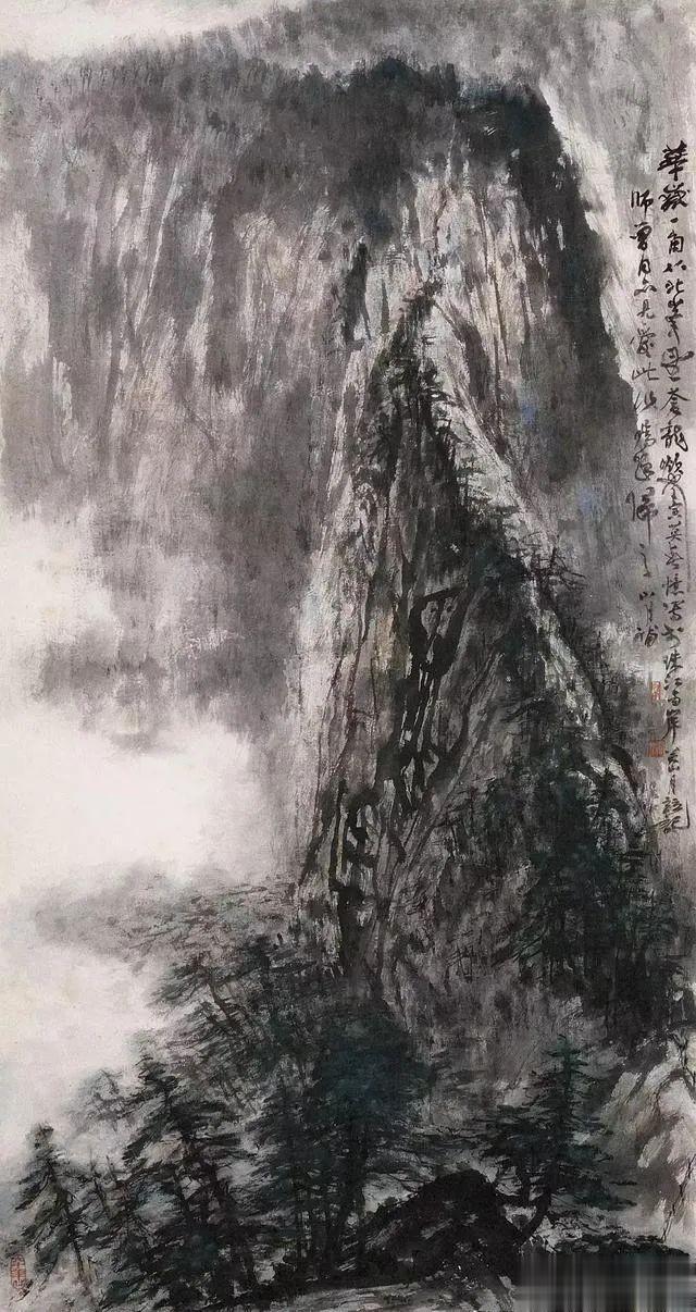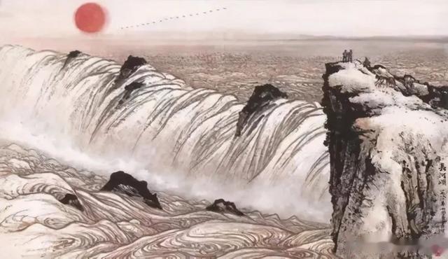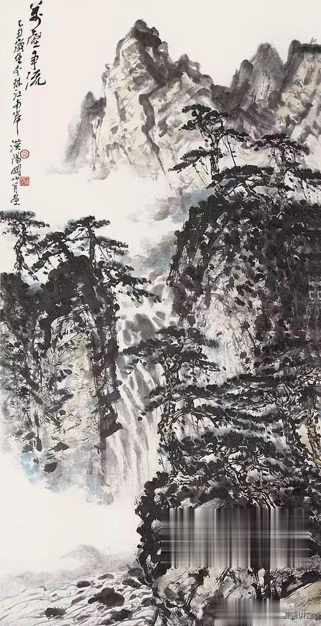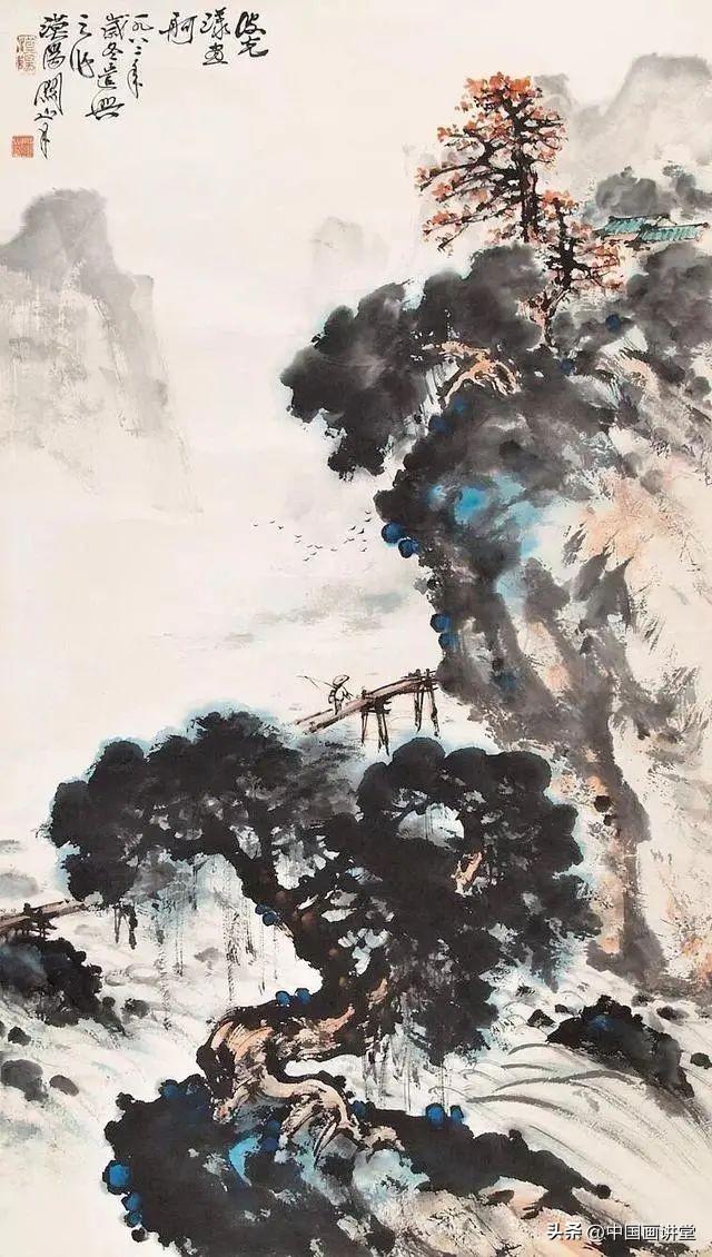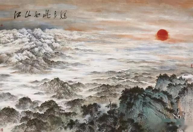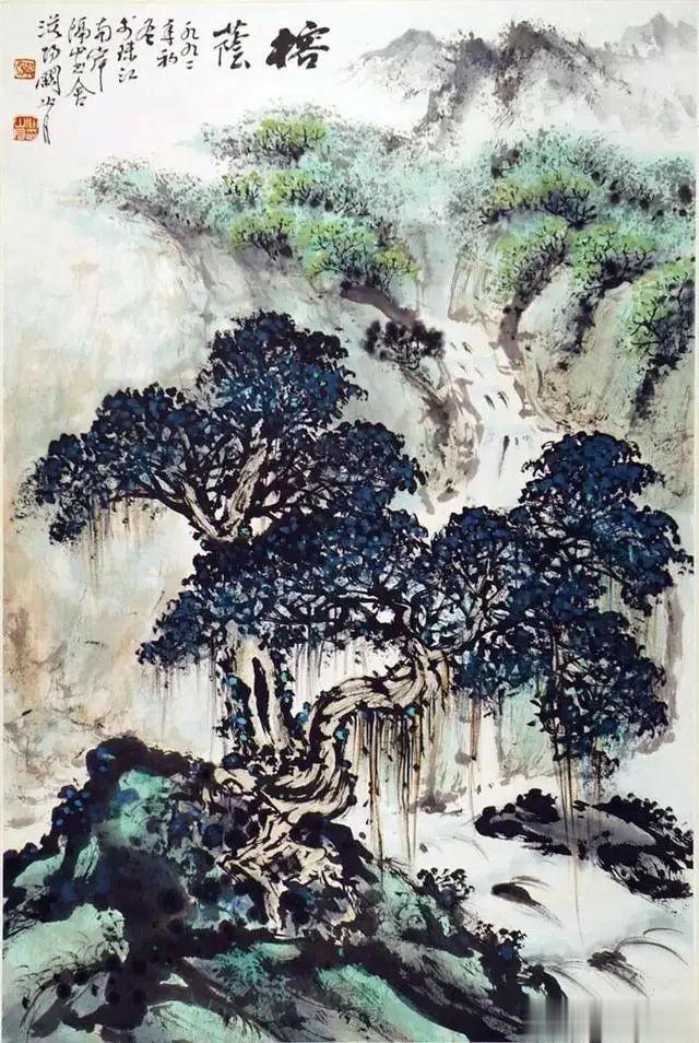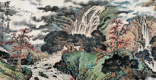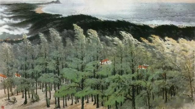 而其另一幅代表作《长河颂》(上图)也有着极其恢宏的意境,奔腾的瀑布之上一轮红日正在冉冉升起,再对比右上角渺小的人类,更感觉自然风光之开阔壮丽。虽作了如此多的壮丽山水画,但在美术界,却认为他的这幅《绿色长城》(下图)才是最好,突破了传统山水的平远和高远,在透视上吸收了西方绘画的元素,有光影效果的同时保留了中国画的韵味,将西画和国画传统结合得很完美。