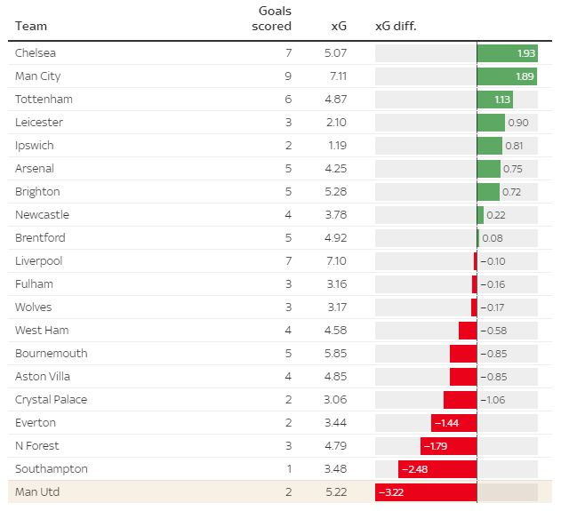 曼联在英超联赛前三场比赛中只进了两球,但这并不是因为机会不足。实际上,他们在预期进球数方面排名第五。糟糕的射门让他们的预期进球差值是联赛中最高的。
