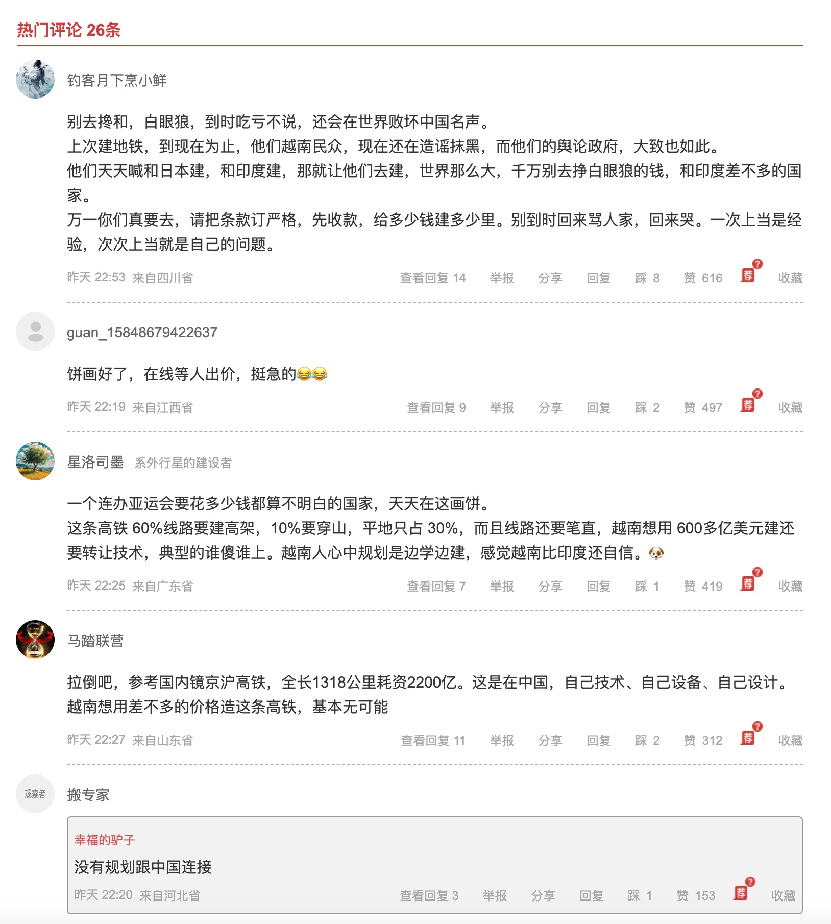 对此,有热心网友表示,“越南大饼已经画好,在线等人出价,还挺着急”“这条铁路建设由于地形复杂,60%的线路需要桥梁,10%的线路需要隧道,只有30%的线路计划在地面铺设,越南想用670亿美元建设还要转让技术,典型的谁傻谁上。越南人的规划就是边学边建,感觉越南比印度还自信”“上一次当时经验,而此次上当是什么?”“上次中国帮助越南建地铁,而到现在为止,越南人还在对中国造谣抹黑,河内大致也是如此”,此类言论多如牛毛,看来越南的口碑还是有待商榷的。