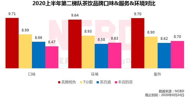 从综合对比(产品、服务与环境)来看,7分甜的整体表现处于中上水平,跟茶颜悦色相比有较大差距,但表现要略好于其他品牌。