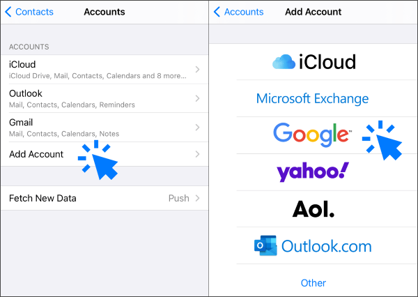 步骤 2. 在 iPhone 上,导航至“设置”>“邮件”>“帐户”>“添加帐户”,然后添加您的 Google 帐户。