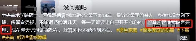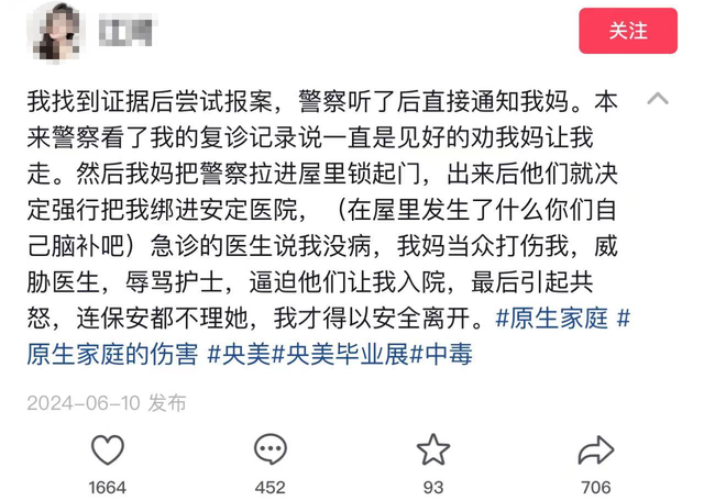 一、央美女硕士自爆长期受父母虐待“被下毒后,全身都不能动,口吐白沫,天天发烧”。