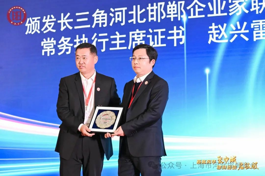 邯郸市人民政府驻上海联络处主任尹延奇为长三角河北邯郸企业家联盟主席颁发奖牌