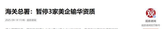 信源:海关总署:暂停3家美企输华资质 2025-04-14 观察者网