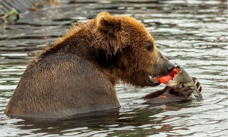 瓦西里的直觉是对的,这只棕熊吃完手里的大鱼还不够,幸亏第二条大鱼来得及时,就在第二条大鱼在水里挣扎的精疲力竭,刚好棕熊也吃完了手里的鱼,于是扑通一下跳下水,抓起这条大鱼就狼吞虎咽的吃了起来。