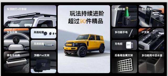例如符合人体工学的A/B柱上车把手、可快拆模块化侧背包支持快拆扩容、全铝轻量化侧面爬梯,以及兼具实用性与硬派越野风格的牛栏杠、车顶行李架、射灯等,通过多元创意碰撞催生差异化生态布局。