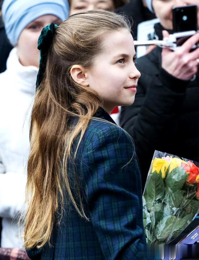 就算是与王室其他成员一同参加的活动,夏洛特公主也是绝对的焦点。虽然她是王位第三顺位继承人,可是夏洛特公主就是这么瞩目。这次,夏洛特公主身穿深蓝色格子裙装外套,金色长发披肩,不是典型的麻花辫造型,深绿色发带扎起部分头发,凯特王妃的审美永远在线。
