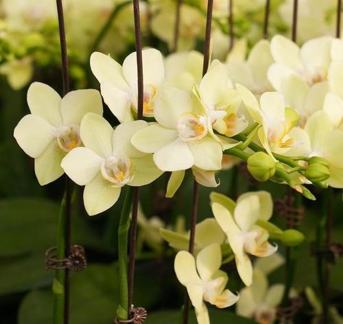 不同品种的蝴蝶兰在这个技术操作上也有些小差异。比如西蕾丽蝴蝶兰,它比较娇弱一些,在诱导双梗的时候就需要更温和的光照和温度环境。而一些比较皮实的品种,像嘉德丽雅蝴蝶兰,在同样的诱导过程中可能会生长得快一点。和蝴蝶兰作个对比的有文心兰,文心兰的花朵虽然没有蝴蝶兰那么像蝴蝶,但也很飘逸,而且文心兰的花期调控在不同的地域方法也不太一样。在华北地区,温度相对低一些,花期的时候要注意防寒,而像在热带的云南部分地区,温度比较合适,花期调控更多是靠光照和施肥来控制。