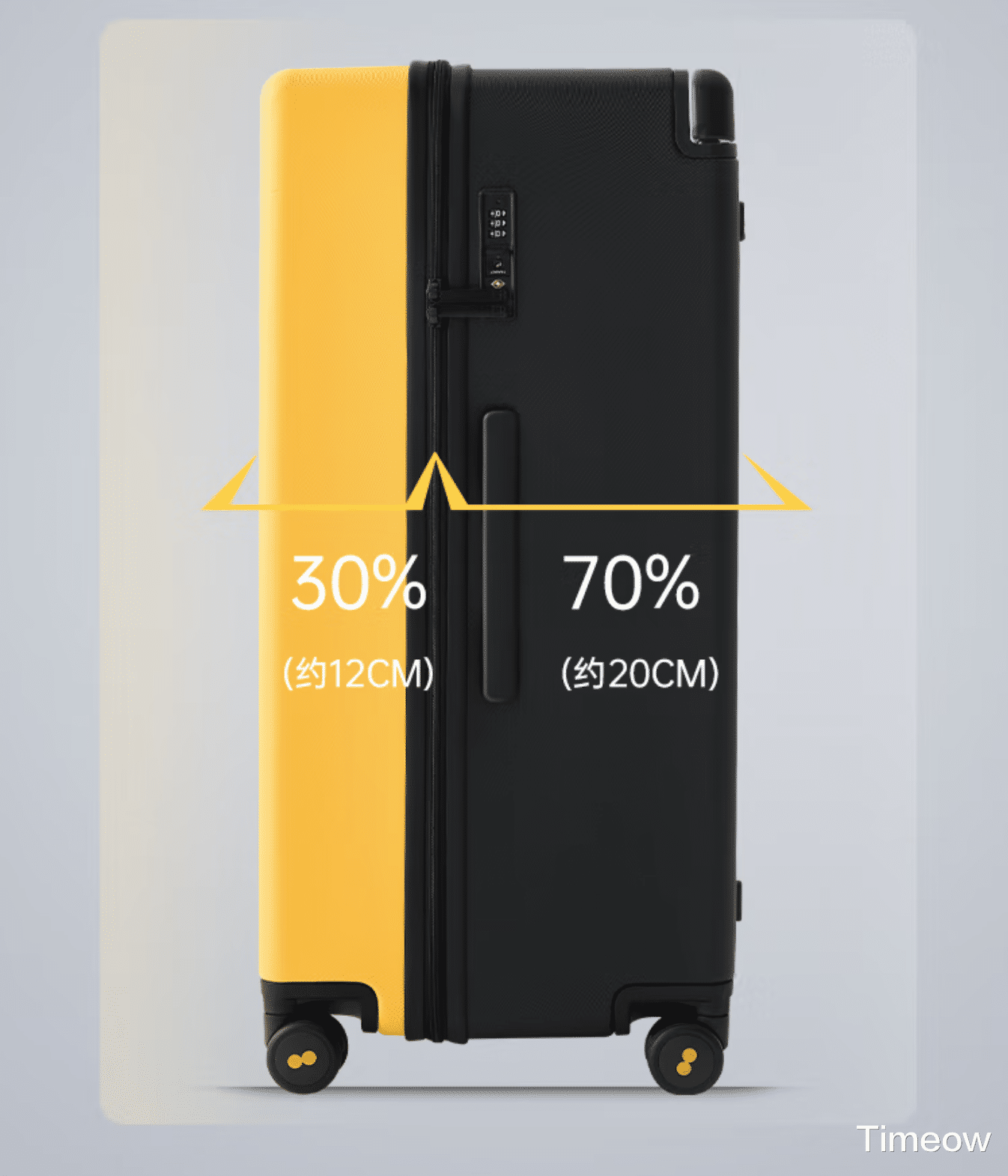 打开之前,先看侧边,它使用了不对称的设计,而26寸和28寸款更是达到了三七开的黄金分割比例。