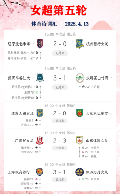江苏女足是联赛唯一不败的队伍,陕西、河南、永川三队依旧不胜。女超第6轮的比赛将在4月19号进行5场,下轮永川女足与上海女足的比赛将延期到5月15号进行。