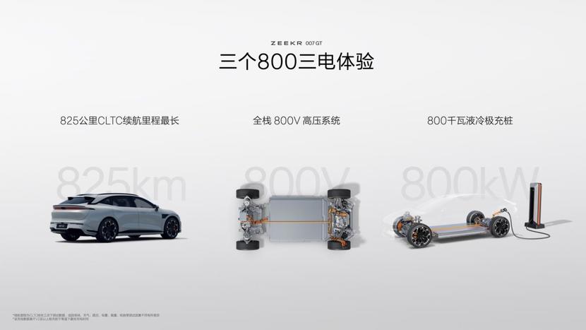 行业最强“三个800”解决方案,让极氪007GT拥有穿越远方的强大能量。标配800V全栈高压系统,搭载100千瓦时麒麟电池的版本,CLTC综合工况续航里程最长825公里。搭载75千瓦时金砖电池的版本,最高充电倍率5.5C,配合极氪自建800千瓦液冷极充桩,仅需10.5分钟电量可从10%充到80%,充电10分钟续航增加440公里。不仅充电快,最高60千瓦车对车放电功率行业最强,放电速度堪比快充桩,极氪007GT就是移动充电宝。
