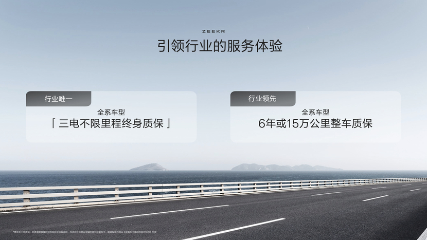 豪华服务,要有引领行业的服务体验。极氪提供全系车型“三电不限里程终身质保”,行业唯一,并在全行业率先取消关于长期停放的全部免责条款。极氪提供高速免费救援服务,行业唯一。新车4年或10万公里内免费道路救援,覆盖全国任何道路,高速拖车费用不限里程全额报销,行业唯一。 还有“1小时快保,24小时快喷”、远程预警诊断及主动提醒、车辆代客值守、免费取送车、免费维保接送等服务,新老用户同享。