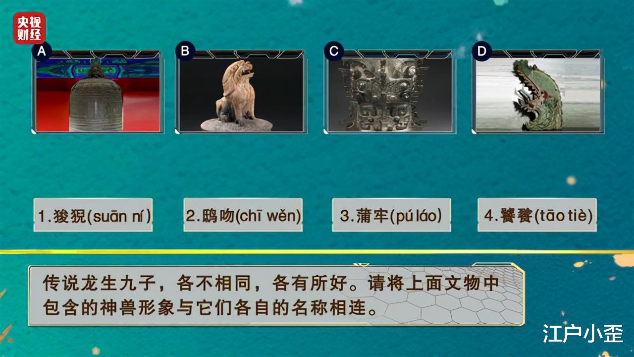 题目中的几个龙子名字,想要念对发音都成问题,要选出对应的文物就更难了。虽然我对龙之九子早有耳闻,只是未知其详。