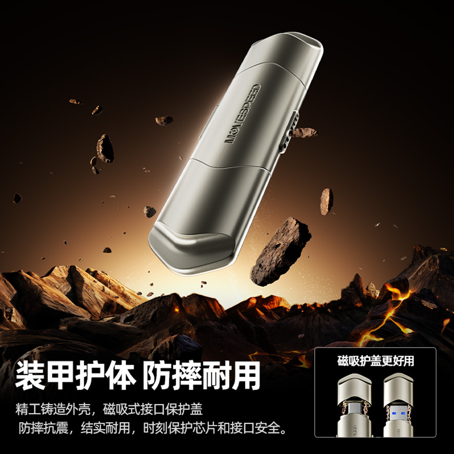 移速极夜NT10双接口固态U盘采用精工铸造的金属外壳,抗震耐摔,同时提升散热效率,保障数据安全。小巧精致的体积搭配香槟色金属外壳,质感出众,即便在正式商务场合也能完美融入。