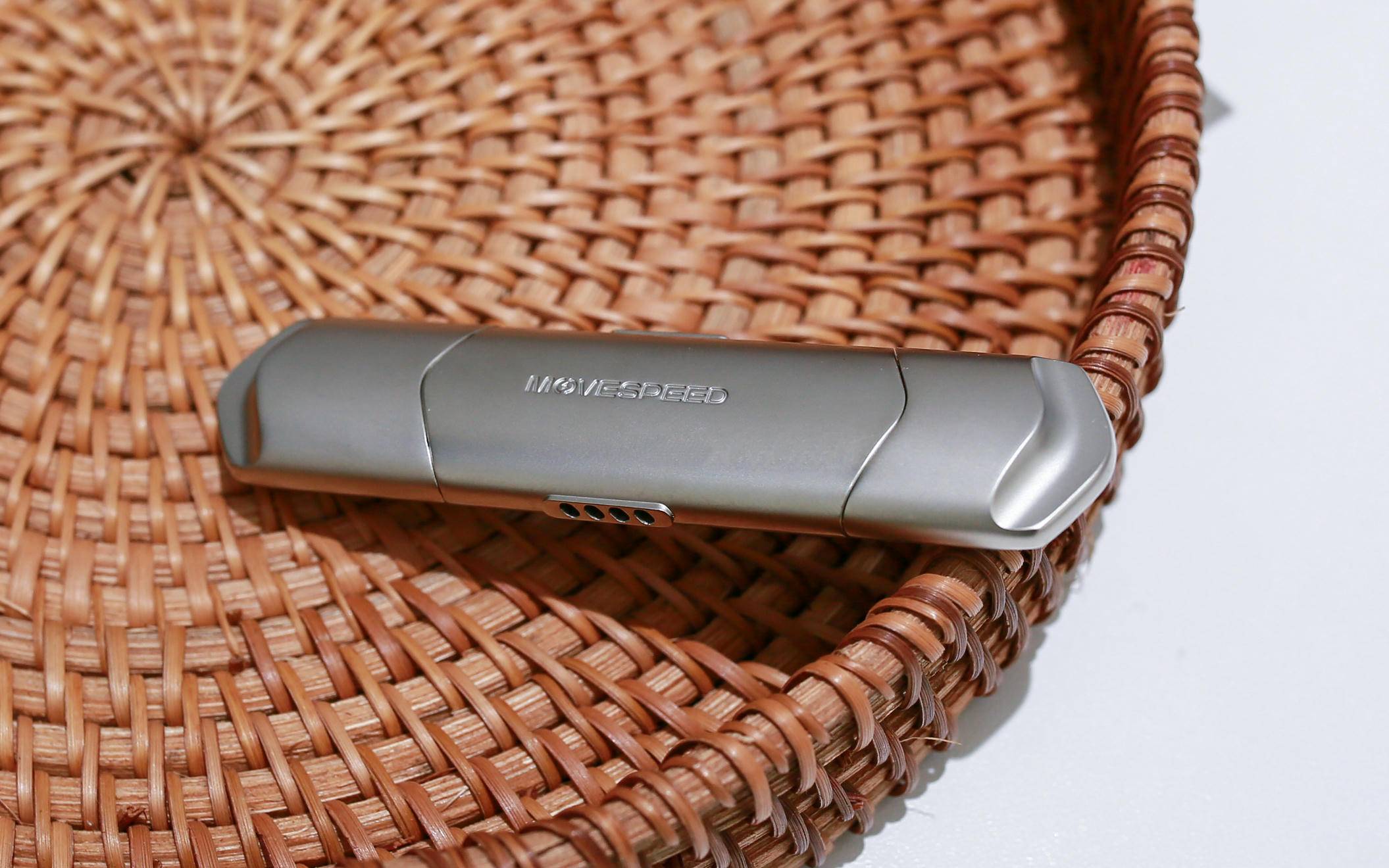 移速极夜 NT10 固态 U 盘 正面中央印有品牌 LOGO——MOVESPEED,简约大方,辨识度极高。整体设计兼具 时尚感与实用性,无论是日常使用还是商务场合都能完美融入。U 盘厚度仅 10.8mm,重量 46g,握持舒适,随身携带毫无负担,可直接放在手心里。相比我目前使用的固态硬盘,它体积更加小巧,便捷性大幅提升。
