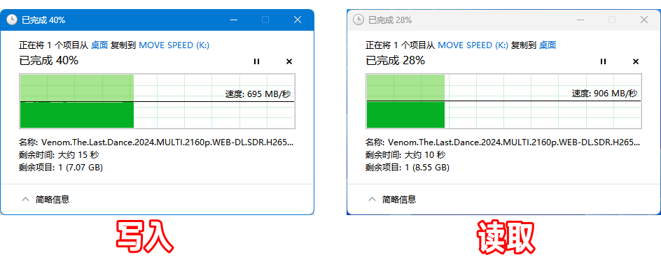 除了软件测试,笔者还进行了 视频拷贝与剪辑 等实际使用场景测试。拷贝 12GB 电影文件 时,移速固态 U 盘的 写入速度可达 695MB/s,读取速度高达 906MB/s,20GB 大文件传输 仅需数秒,且整个过程平稳流畅,无掉速现象。这得益于移速采用的 高品质 TLC 闪存 + 直写算法,不仅提供高速传输,还能保证长时间使用的稳定性,是专业视频剪辑与大文件存储的理想选择。