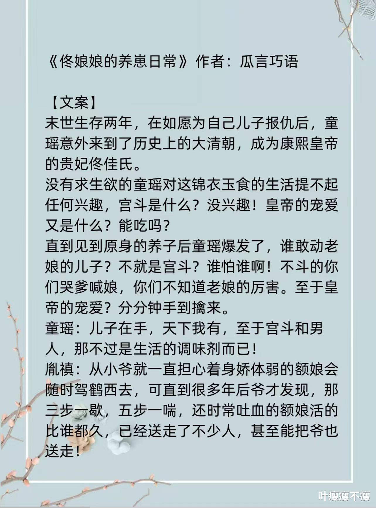 古言,文如其名,就是女主的后宫养娃日常,顺带来点不是那么正经的宫斗。没有感情线,康熙皇帝是块工具砖,哪里需要往哪搬。如果看腻了甜宠文,可看这篇文放松放松。