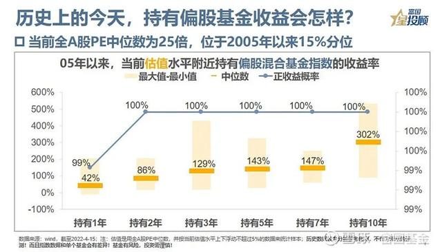 数据显示,目前全A股PE中位数为25倍,位于2005年以来15%分位水平。富国基金统计了从2005年到现在,当估值处于当下水平时,持有偏股混合基金不同时间的回报率。
