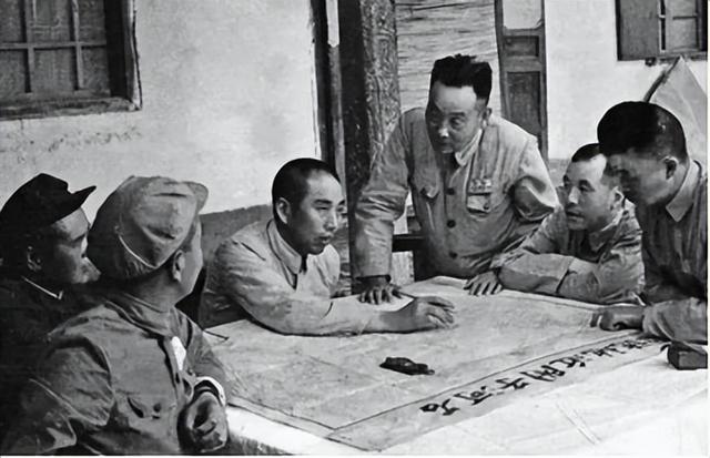 新疆军区司令员兼政委王震(左三)和新疆军区副司令员陶峙岳(右三)等研究石河子地区军垦计划