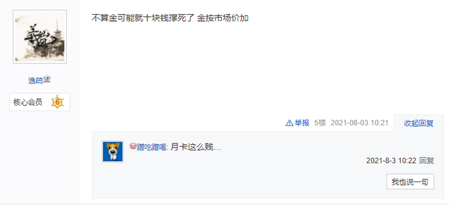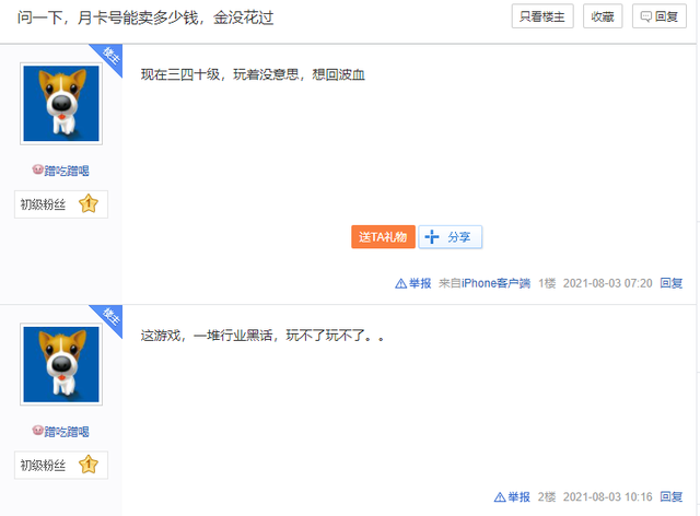 被坑了之后,很多搬砖党想要退坑止损,但是《剑网3》怀旧服的账号采用了月卡制,玩家们已经冲了卡,不玩的话一分钱也拿不到。在这样的情况下,不少人询问自己的账号能卖多少钱,可得到的答案更让他们失落——如果角色门派太大众化而且账号上没有很多金的话,一个刚玩了三五天的月卡账号十块钱就撑死了,而即便算上金价,也不过多了几块钱的样子。想到刚刚48块钱一个月的账号只值这么点钱,不少人无奈的表示:月卡这么贱……赔死了。