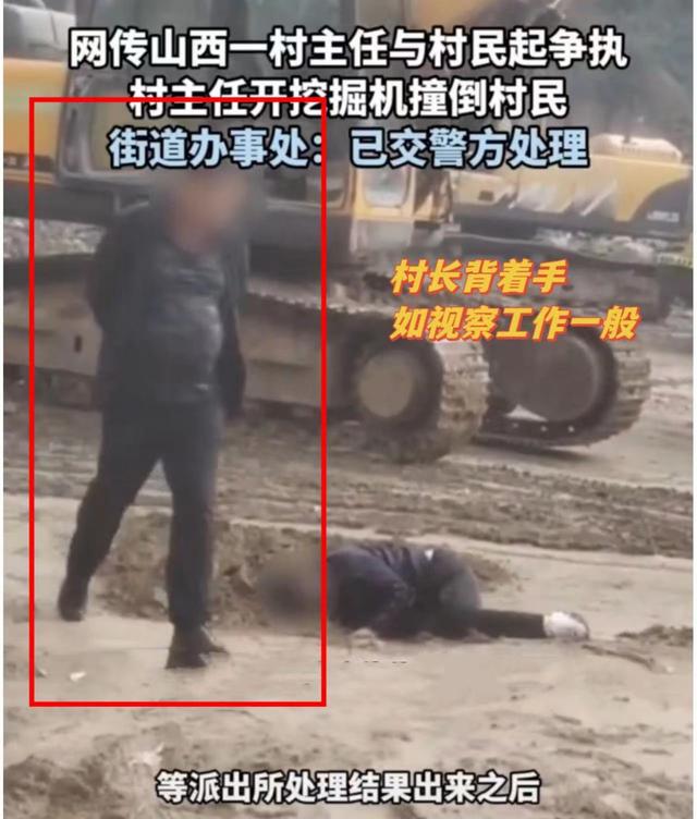 随后,我们看到一位大腹便便的中年男人,从挖掘机驾驶舱内不紧不慢的下来,看了一眼地上的村民,不慌不忙地背起手来,如领导视察工作一样。