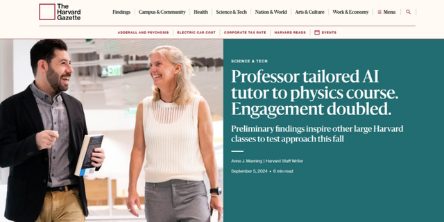 近期,哈佛大学(Harvard University)的一项研究得出的意想不到的结论,该研究考察了去年秋天一门大型热门物理课程中学生与定制的人工智能聊天机器人合作的学习效果。与更典型的“主动学习”课堂(学生以小组形式向人类教师学习)相比,人工智能支持的学习效果出人意料地好。