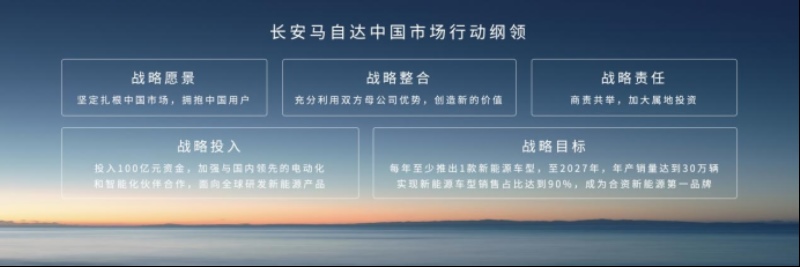 一、战略愿景,坚定扎根中国市场,拥抱中国用户。基于中国市场的电动化和智能化创新成果,坚定推进长安马自达新能源转型,深度融合马自达核心DNA,构建电动化时代的核心竞争力;二、战略整合,充分利用长安、马自达两家百年车企优势资源,夯实全新的合作模式,加强内部业务协同,提升资源共享水平,持续创造新价值,实现高质量可持续发展;三、战略投入,面向2027年,在新能源领域累计投入100亿元,不断加大人才、设备领域的投入,加强与国内领先的电动化和智能化伙伴的战略合作,培育面向全球的新能源产品开发能力;四、战略目标,2024年开始,每年至少向中国市场推出1款新能源车型,不断扩大轿车、SUV细分市场覆盖。2027年力争实现新能源车型销售占比达到90%,年产销量达到30万辆,成为合资新能源第一品牌;五、战略责任,切实履行在中国市场的企业社会责任,提升长安马自达企业、品牌参与者的幸福感。加大属地投资,吸引更多产业配套落户。在南京工厂200万辆累计产销基础上,向下一个200万辆产销周期持续迈进。