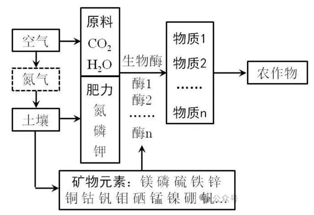 空气的作用是提供二氧化碳、水和氮气作为原料,但空气中的氮气分子结构极其稳定,不能直接被农作物利用,只有通过土壤微生物转化为活泼氮源才能被农作物利用。土壤的作用一方面提供氮磷钾(肥力)等作为原料,另一方面提供矿物元素作为生物酶的活性组分。在生物酶催化作用下,农作物通过光合作用将原料转化为一系列物质,如碳水化合物、脂类、氨基酸、蛋白质和维生素等。