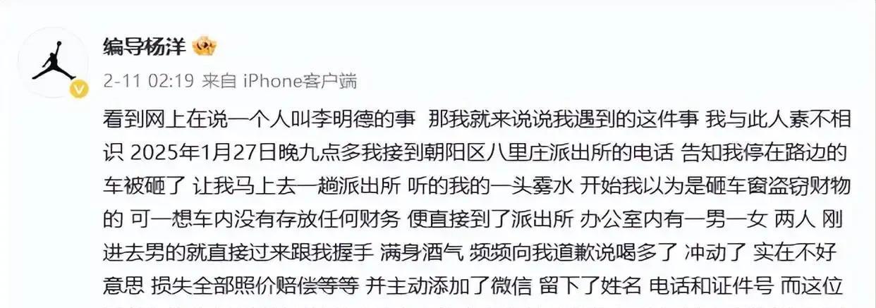 哪知道这哥们得意忘形过了头。过年前几天,北京一个搞影视的杨编导突然爆料,说李明德喝醉酒砸了他的车。刚开始李明德装得跟孙子似的道歉,结果维修费清单一出来就翻脸不认账,还把人家联系方式拉黑。这下可好,直接被警察叔叔带走了。北京日报直接点名批评:“明星违法绝不能惯着!”要我说啊,这真是应了那句老话——自己作的孽,跪着也得吃完。