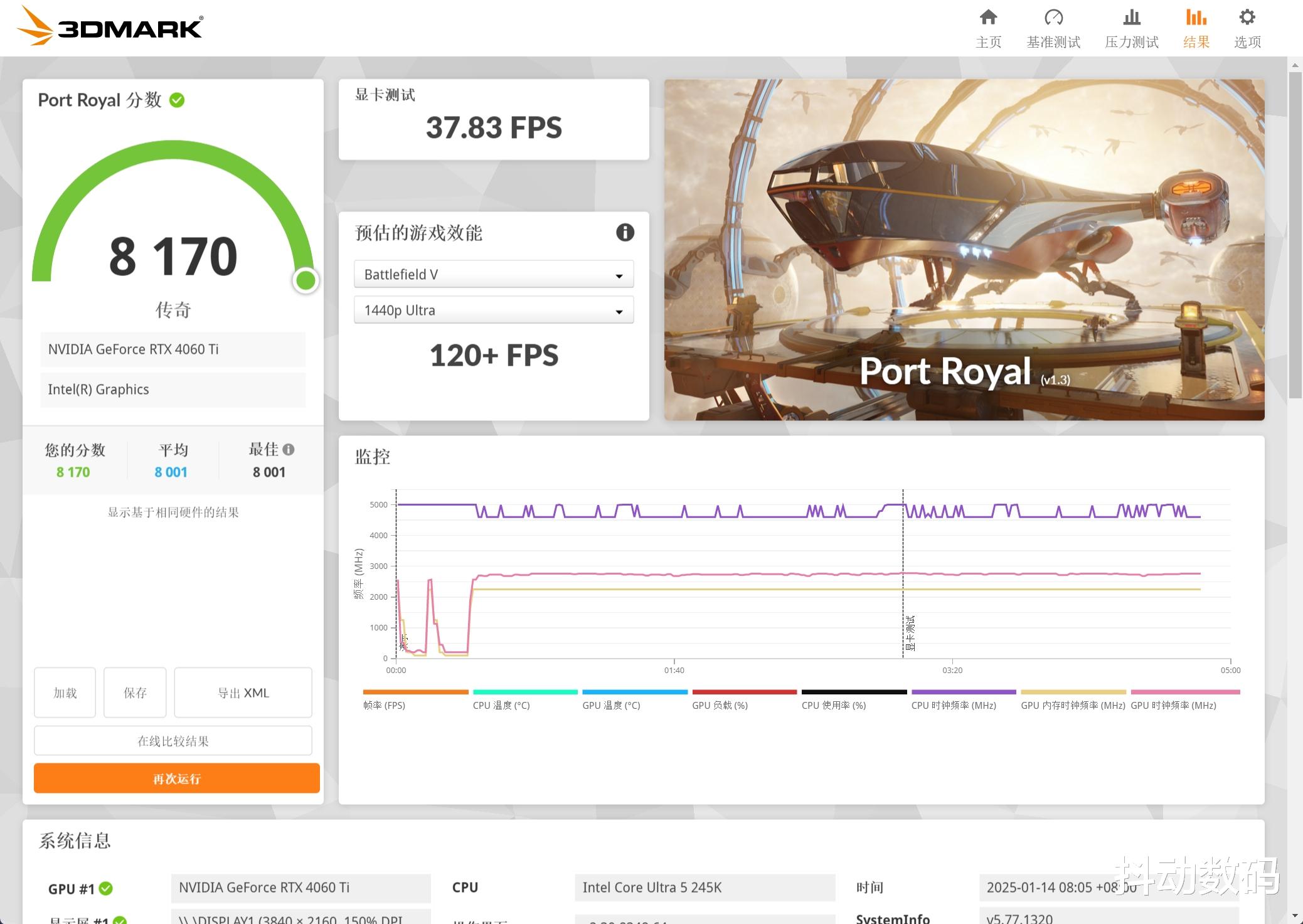 245K的AIDA 64 FPU单烤测试下功耗151W,温度80℃,频率5.1Ghz。看来新一代Ultra200S的功耗与温度控制还是非常不错的。