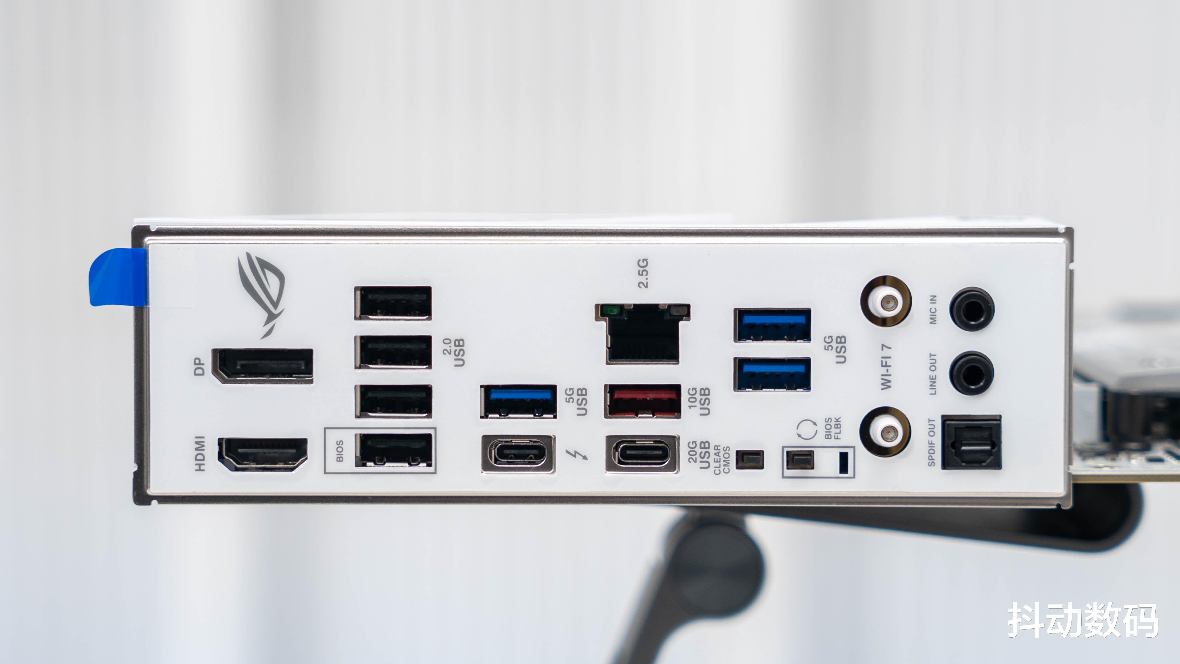 IO接口部分,B860芯片组的小吹雪也有一个雷电4接口。这可是没有减配的40Gbps USB 4.0接口哦。此外这次的小吹雪主板的其他扩展性也是不错的,提供了8个USB-A接口方便扩展,其中四个USB 2.0、三个蓝色的是 USB 3.2 Gen1,以及一个红色的10Gbps的USB 3.2 Gen2和一个20Gbps的Type-C接口方便扩展。
