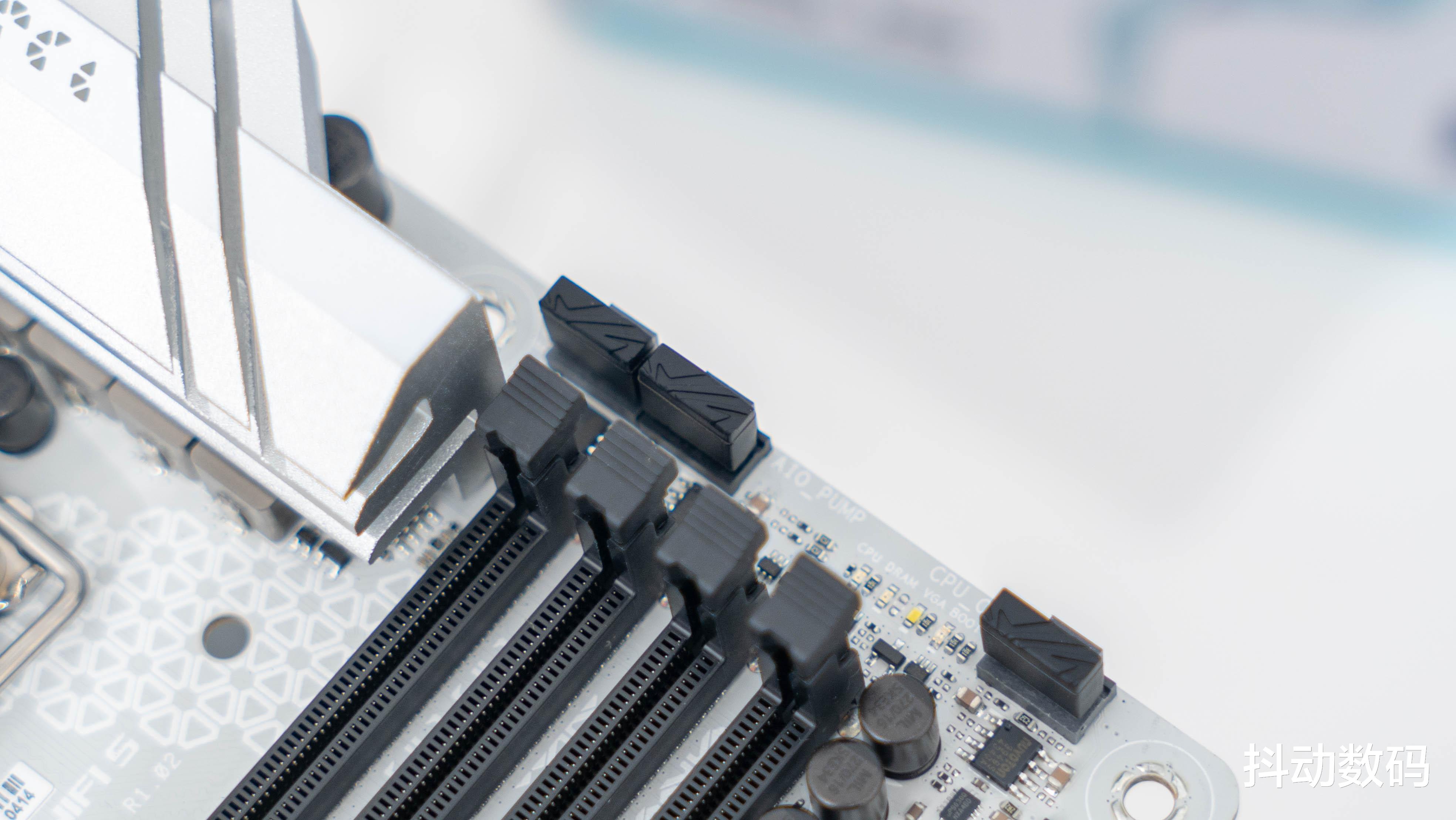 细节方面,在内存插槽上方的4 Pin风扇插座上还提供了ROG元素的软胶盖。主板的Debug灯也设计在主板顶部,可以通过Debug灯快速判断电脑运行问题。